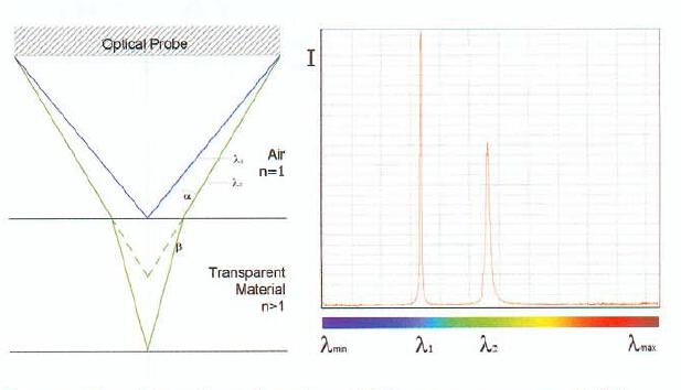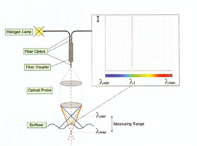 該系統(tǒng)主要由光譜儀、光源和光學(xué)探頭組成;光源通過多模光纖進(jìn)入光學(xué)探頭,光學(xué)探頭將不同波長的光聚焦到透鏡上不同距離處形成色散,同時在透鏡上下表面不同波長的光形成自垂直產(chǎn)生反射光譜信號進(jìn)入光學(xué)探頭傳輸進(jìn)入光譜儀獲得不同波長的離焦量;然后通過軟件算法計算得到透鏡的中心厚度。