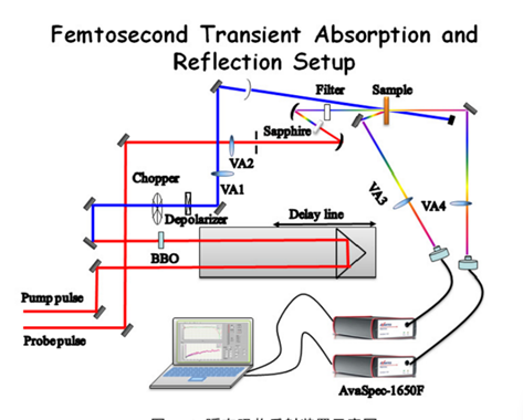 AvaSpec-ULS2048CL-EVO光譜儀在超快應用測試中可采用單通道或雙通道兩種方式。單通道方式是使用一臺光譜儀預先測試存儲未放置樣品時寬帶白光的光作為參考,隨后使用該光譜儀測試白光經過樣品后的吸收光譜。雙通道方式是采用兩臺光譜儀,一臺光譜儀測試白光經過樣品的光譜,另外一臺光譜儀實時測試寬帶白光的光源作為參考,避免光源不穩(wěn)定對結果的影響,兩臺光譜儀可通過歸一化消除臺間差,通過同步線保證響應同步。此外,因為光譜儀的靈活性,研究者可根據自己的實驗需求設計光譜儀的測試方式,以下兩圖為原吉林大學隋來志博士設計的測試光路。