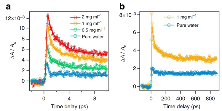 圖 7: Short term (a) an long term (b) kinetic decay of photoreduced graphene oxide in water using a 266nm pump and the differential absorption at 400 nm[4].