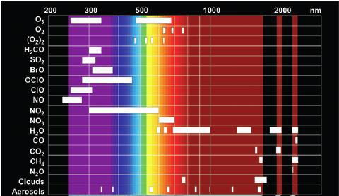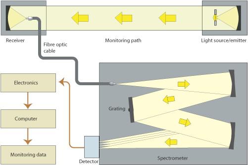 DOAS以比爾-朗伯定律為依據(jù),該定律描述了光路中分子數(shù)與被吸收的光能之間的關系。由于每種分子,每種氣體,都有其吸收光譜特性,或者稱為“指紋”,所以可以通過紫外-可見波長范圍內(nèi)的特征吸收結構同時測量出幾種不同氣體的濃度。典型的DOAS儀器由連續(xù)光源(氙燈、氘燈等),氣室(或開放光路),探測器組成。根據(jù)比爾-朗伯定律: