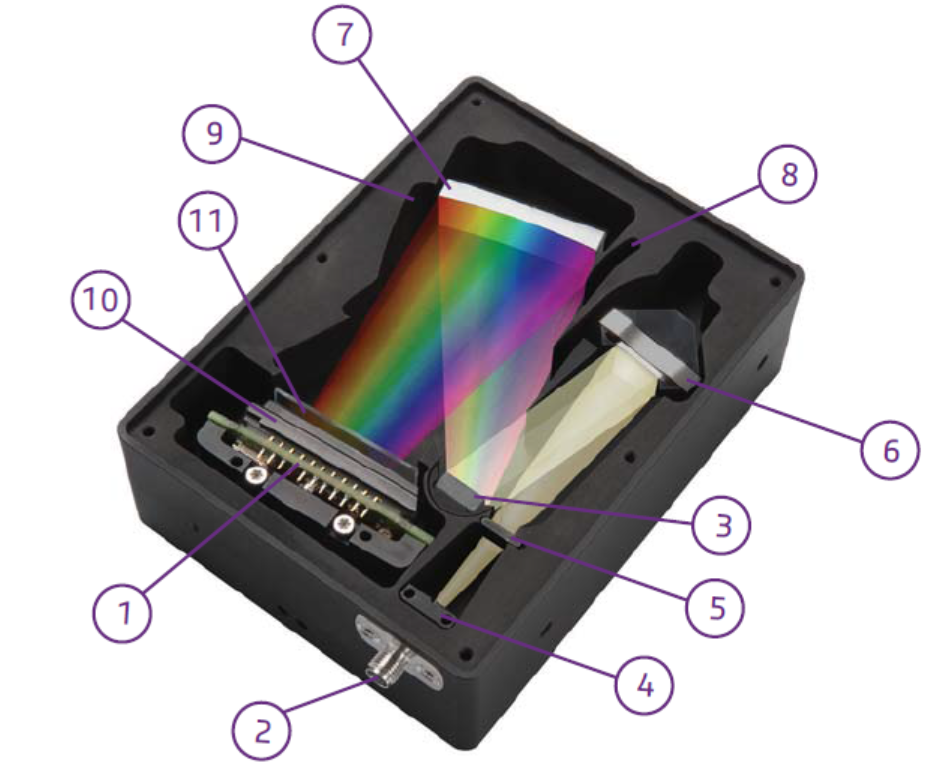 荷蘭Avantes公司的AvaSpec-ULS2048CL-EVO光纖光譜儀,采用對(duì)稱式光路設(shè)計(jì),焦距75mm,包括光纖接頭(標(biāo)準(zhǔn)SMA接口)、準(zhǔn)直鏡、衍射光柵、聚焦鏡和2048像素線陣CMOS探測(cè)器,波長(zhǎng)范圍200-1100nm,分辨率可達(dá)0.06nm,提供USB3.0接口、高速網(wǎng)口和I/O外觸發(fā)同步接口。